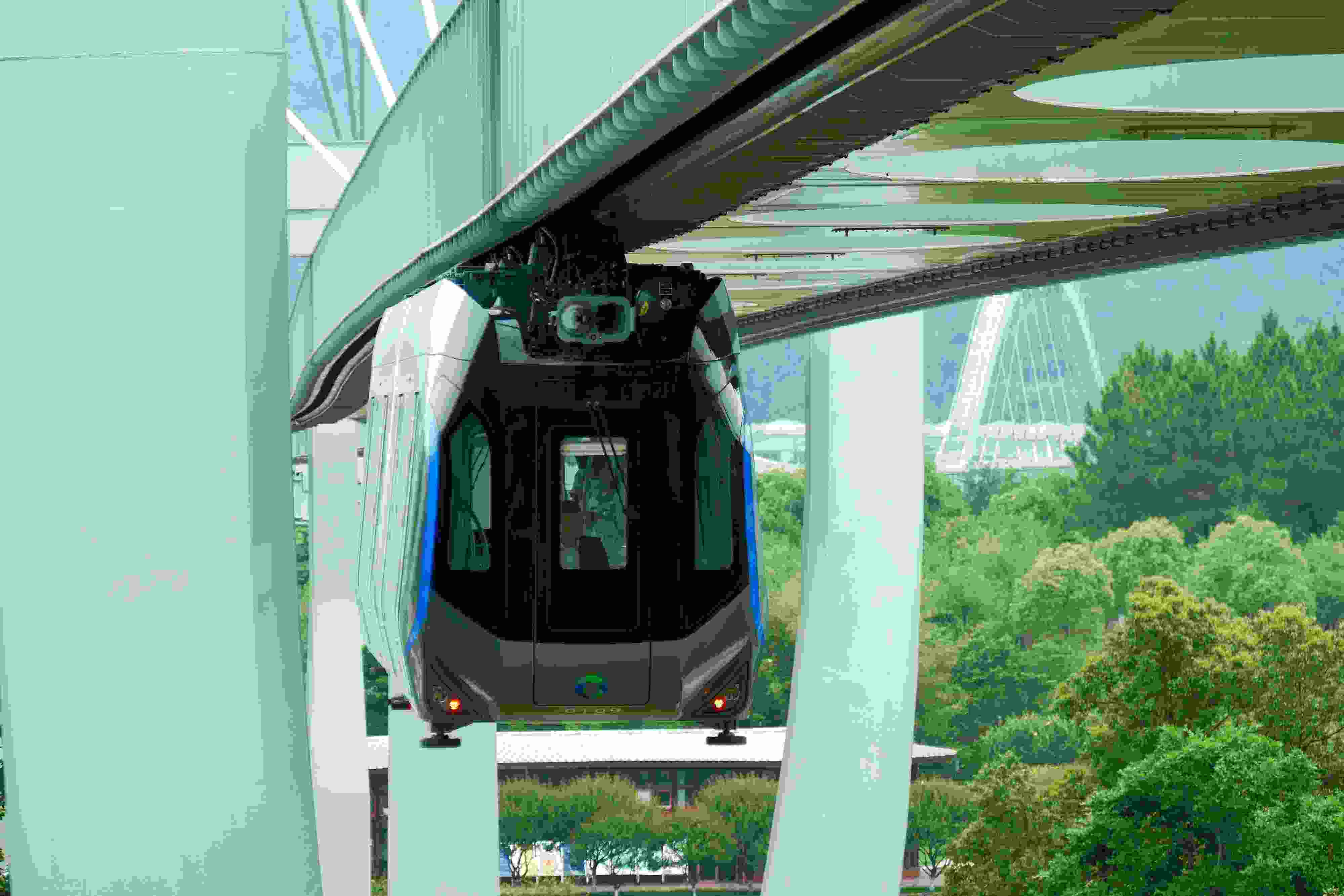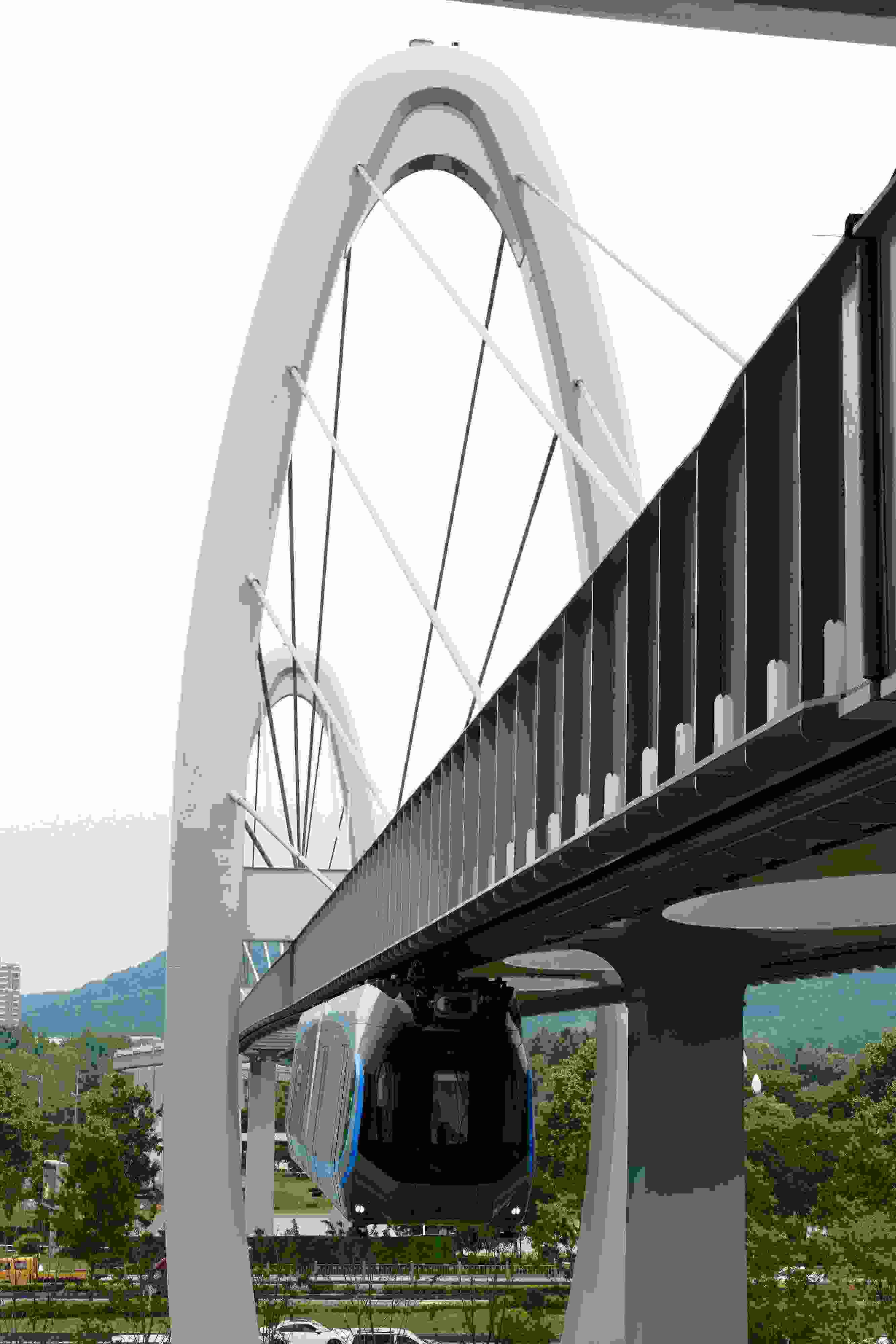 2023年5月11日,武漢,光谷空軌旅游線項目“光谷光子號”空中軌道列車在東湖高新區(qū)試跑。武漢光谷空軌旅游線項目位于武漢市東湖高新區(qū)光谷中央生態(tài)大走廊內(nèi),是生態(tài)大走廊旅游配套基礎(chǔ)設(shè)施之一。其規(guī)劃總長26.7公里,先行建設(shè)的一期工程長約10.5公里,設(shè)車站6座。 視覺中國