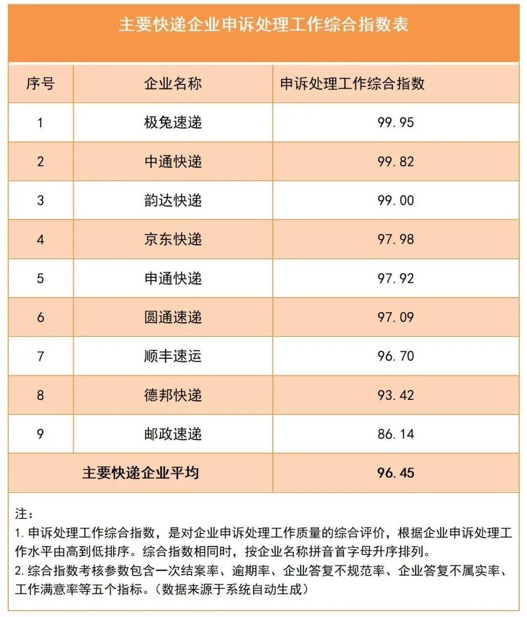 主要快遞企業(yè)申訴處理工作綜合指數(shù)平均為96.45,高于平均值的有7家,低于平均值的有2家。