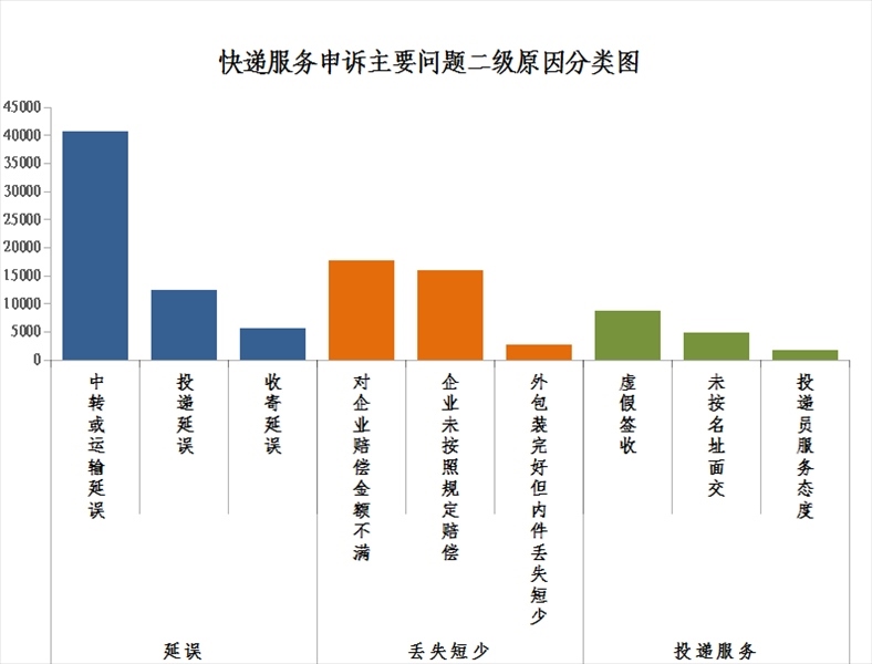 2.郵政普遍服務(wù)申訴主要問題二級原因情況。郵件延誤申訴中主要占比較多的是中轉(zhuǎn)或運(yùn)輸延誤,投遞服務(wù)申訴中主要占比較多的是虛假簽收,郵件丟失短少申訴中主要占比較多的是企業(yè)未按照規(guī)定賠償。