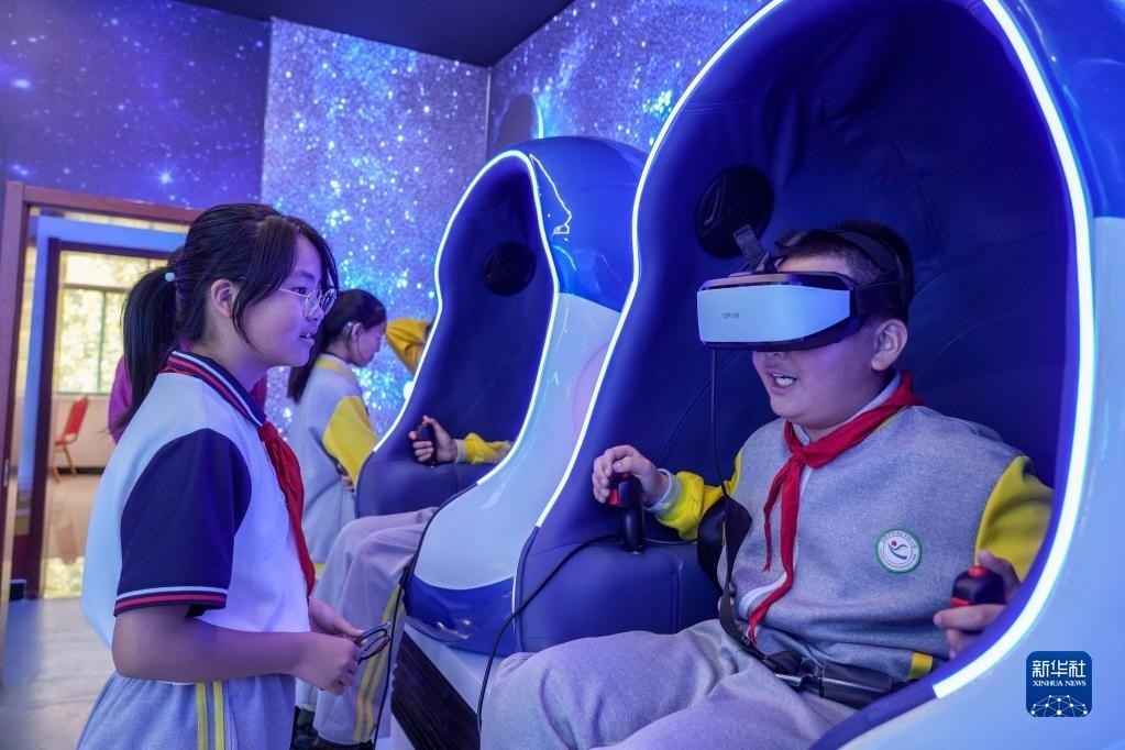 5月11日,小學(xué)生在馬店村科普體驗中心內(nèi)體驗VR科普展品。