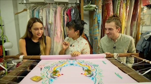 “老板,我是來做戲服模特”“我來考察非遺文化項目”美國的潘明花和意大利徐天佑一起來到狀元坊戲服工廠,戲服刺繡傳承人何鳳婷熱情地講述著戲服刺繡的歷史、制作工序、角色樣式,也讓他們親自體驗了刺繡。潘明花驚嘆于刺繡工藝遠比想象中要復(fù)雜得多。他們穿著戲服走近粵劇博物館,深入了解以粵劇為代表的嶺南文化。徐天佑表示戲服刺繡非遺的傳承不僅是技術(shù)工藝的傳承,同時也是文化的傳承。何鳳婷說如何讓更多年輕人喜愛和關(guān)注這項手藝,如何能繼續(xù)傳承下去是目前亟待解決的問題。為了讓刺繡與現(xiàn)代審美相結(jié)合,老板將刺繡工藝與年輕人喜愛的IP玩偶組合,將“激活非遺+創(chuàng)新思路+文化傳承”理念融入到刺繡中,讓這門手藝更面向大眾,推動非遺的創(chuàng)造性轉(zhuǎn)化,提高與現(xiàn)代生活的緊密度,成為融入現(xiàn)代生活中的潮流元素,讓非遺重?zé)ü獠省?/p>
