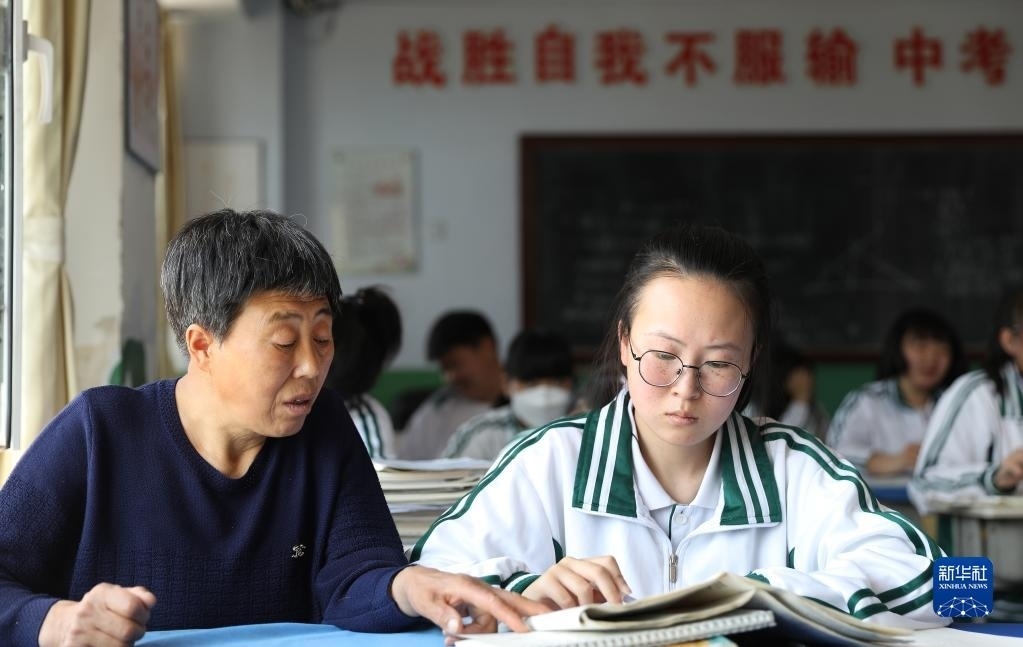 張連琴(左)和女兒李昕偉在教室內(nèi)聽課(5月8日攝)。