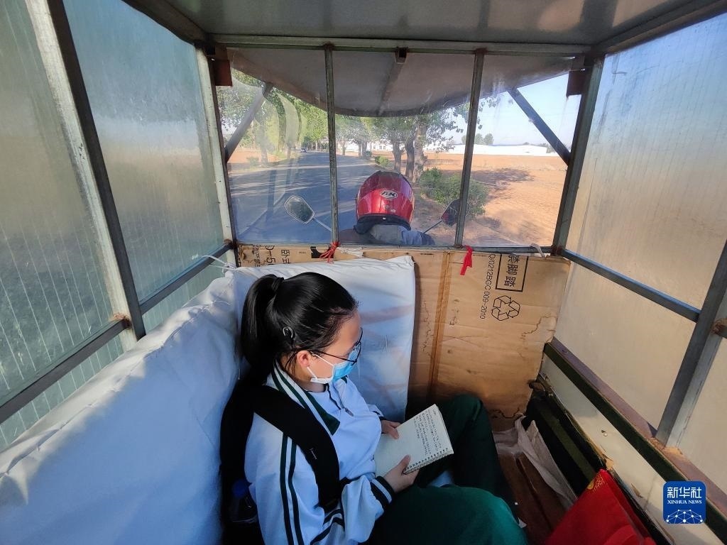 清晨,張連琴騎著電動(dòng)三輪車?yán)畠豪铌總トド蠈W(xué),女兒在車棚內(nèi)背誦詩詞(5月8日手機(jī)拍攝)。