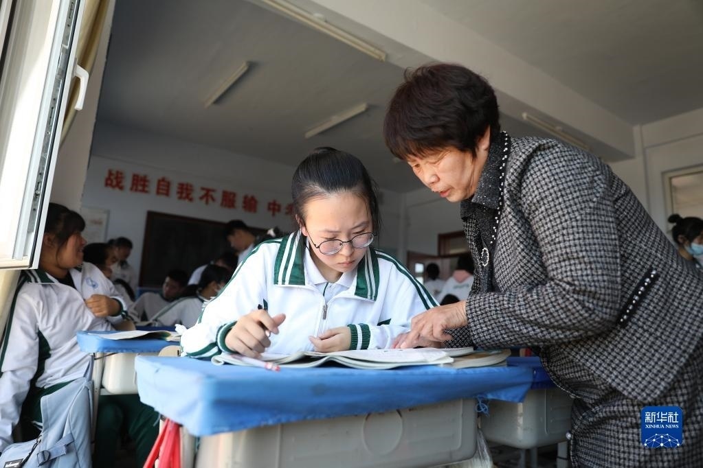 張連琴(左下)和女兒李昕偉在教室內(nèi)聽課(5月8日攝)。