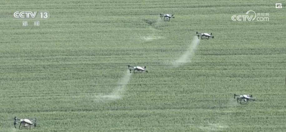 在運城河津市的小麥地里,10架無人機正在麥田上方進行噴灑作業(yè)。
