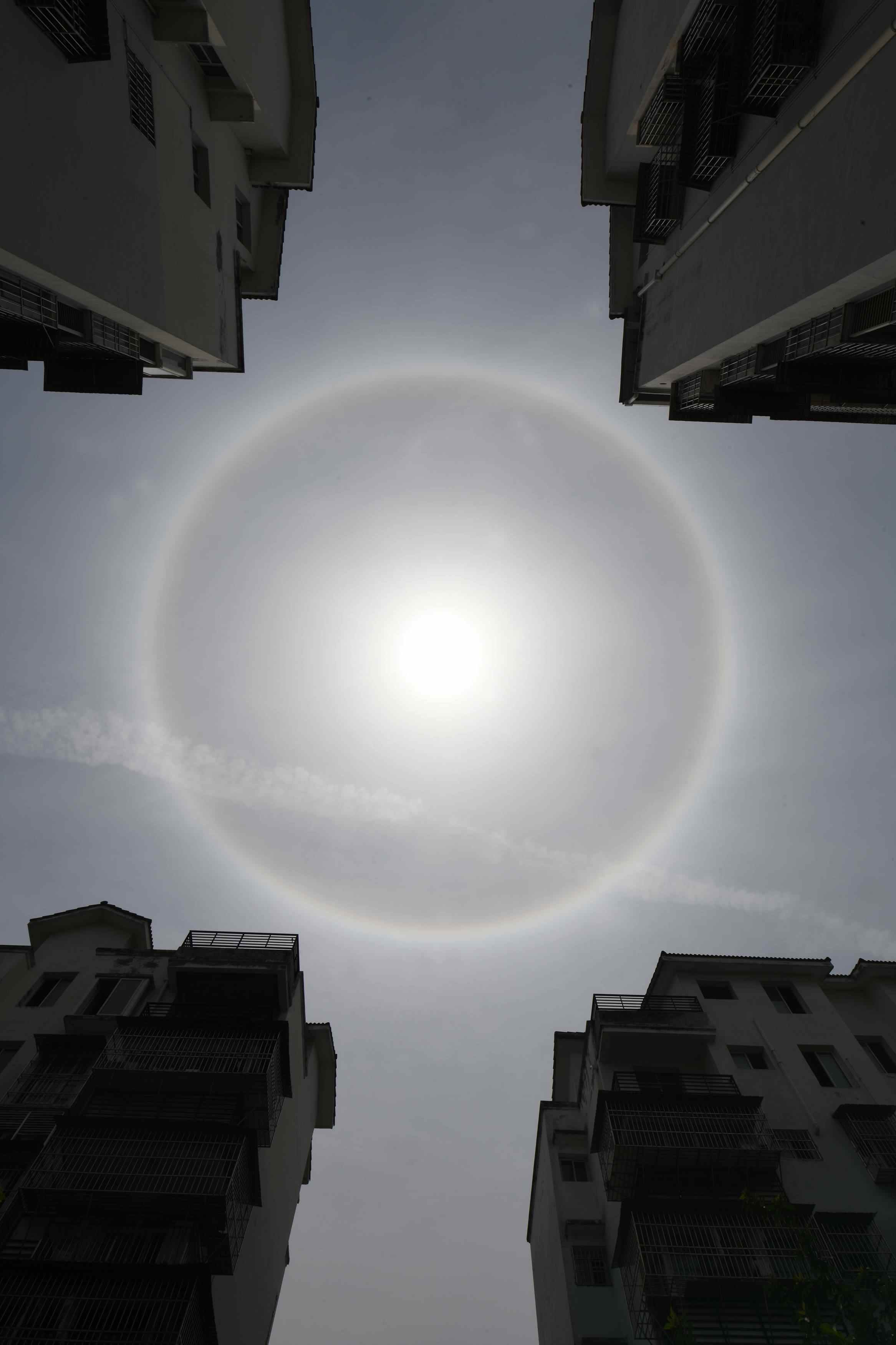 2023年5月15日中午,湖北宜昌,天空出現(xiàn)日暈景觀。當日,多地天空出現(xiàn)日暈。日暈是一種大氣光學現(xiàn)象,是太陽光通過云層中的冰晶折射或反射而形成的。 視覺中國