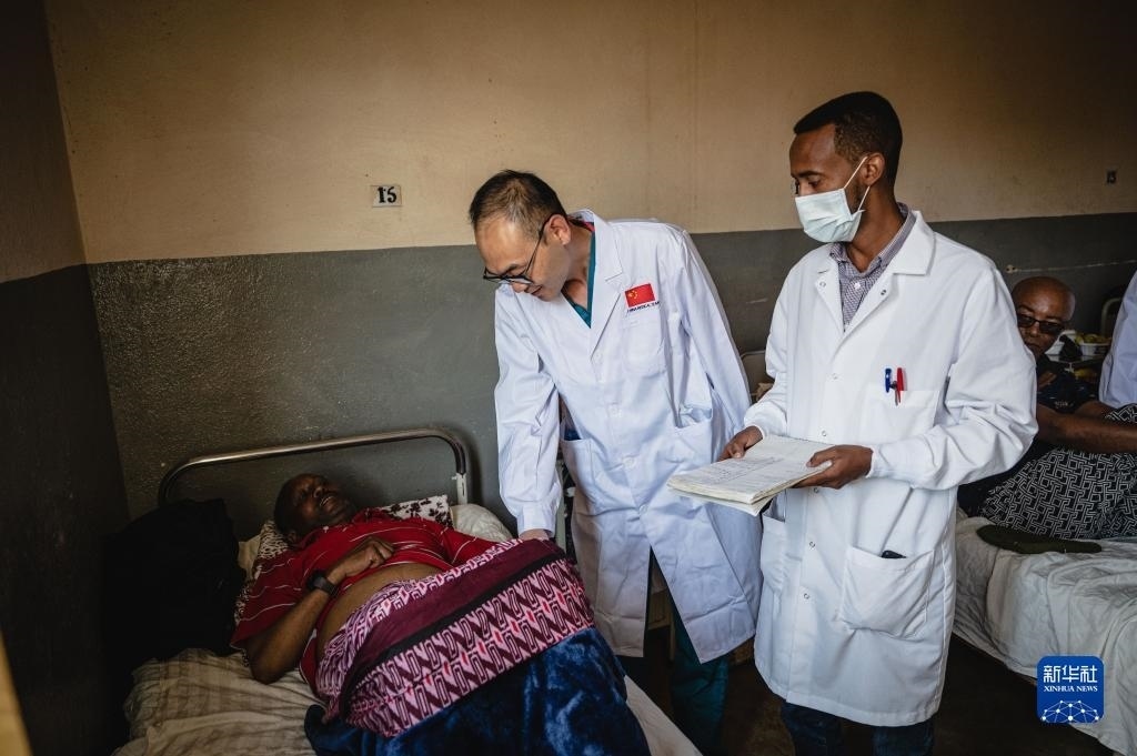 5月9日,在厄立特里亞首都阿斯馬拉的哈利貝特醫(yī)院,醫(yī)療隊(duì)普外科醫(yī)生邢宏彬(中)為患者做檢查。