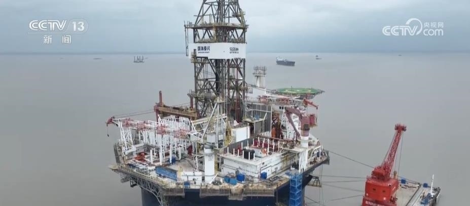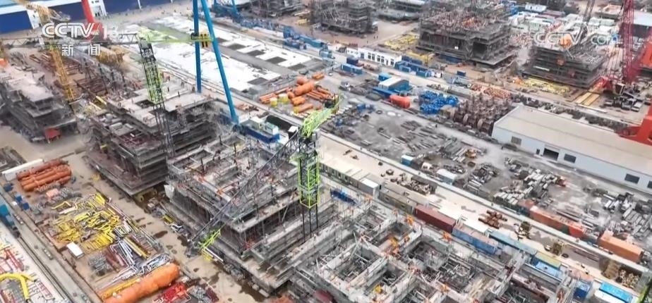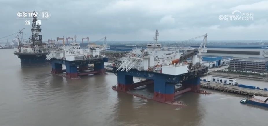 這些大家伙,都是世界技術比較領先的一些海工裝備。通過航拍的鏡頭,給大家展現一下,最遠的是圓筒形超深水鉆探平臺。因為它的外形是獨特的圓筒型設計,所以它的抗風浪性、作業(yè)水深的能力非常得好,技術指標創(chuàng)下多項世界第一。這家企業(yè),一共向國外交付了6艘同類型的產品。