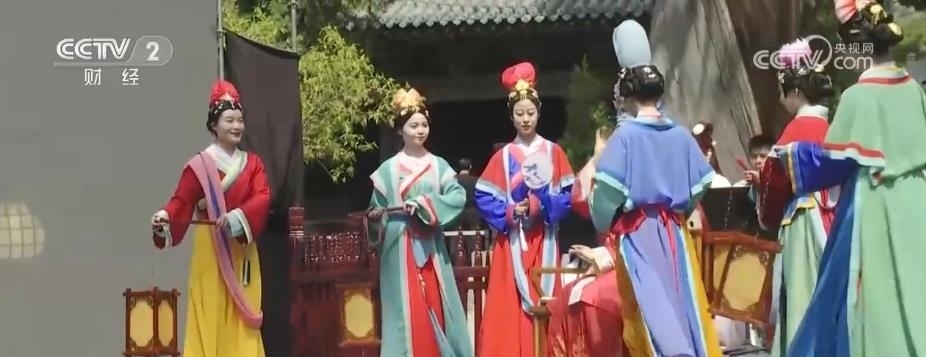 在晉祠的標志性建筑圣母殿前,一場場穿越古今的表演登臺亮相?!稌x祠十二時辰》由晉祠講解員自行編排而成,生動還原了圣母殿內(nèi)人物的一天。從服飾裝扮到生活起居,她們用舞蹈讓雕塑“活”了起來,也使游客從別樣的角度領(lǐng)略了圣母殿折射出的文化魅力。