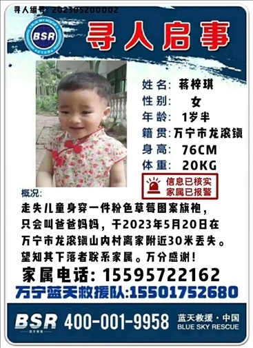 ·海南萬(wàn)寧一歲半女嬰丟失一夜未歸,丟失地點(diǎn)離家僅30米。