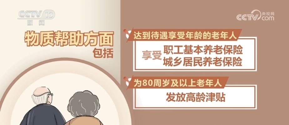 物質(zhì)幫助方面包括:達(dá)到待遇享受年齡的老年人享受職工基本養(yǎng)老保險(xiǎn)和城鄉(xiāng)居民養(yǎng)老保險(xiǎn);為80周歲及以上老年人發(fā)放高齡津貼;為經(jīng)濟(jì)困難的老年人提供養(yǎng)老服務(wù)補(bǔ)貼;為經(jīng)認(rèn)定生活不能自理的老年人提供護(hù)理補(bǔ)貼;為納入最低生活保障范圍的老年人提供最低生活保障;經(jīng)認(rèn)定符合條件的殘疾老年人享受困難殘疾人生活補(bǔ)貼和重度殘疾人護(hù)理補(bǔ)貼;對(duì)生活無(wú)著的流浪、乞討老年人依照有關(guān)規(guī)定給予救助。
