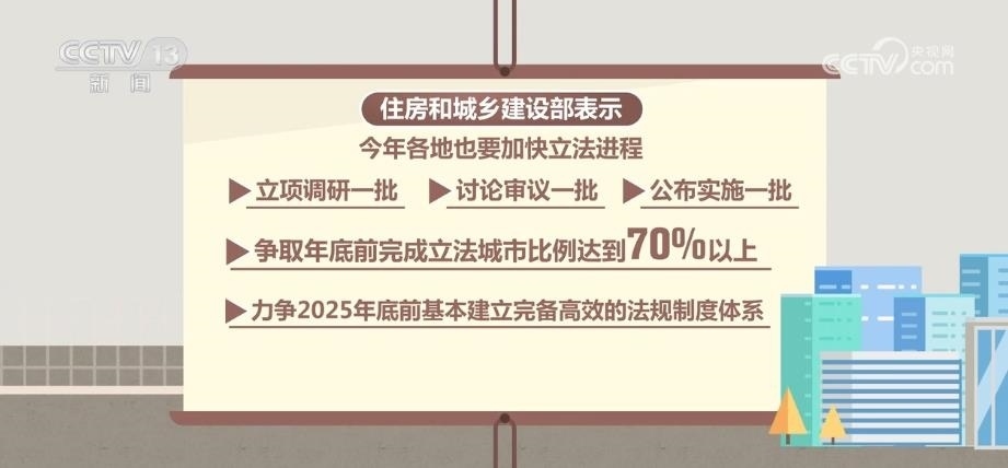 住房城鄉(xiāng)建設(shè)部表示,2023年,各地也要加快立法進(jìn)程,立項(xiàng)調(diào)研一批、討論審議一批、公布實(shí)施一批,爭取年底前完成立法城市比例達(dá)到70%以上,力爭2025年底前基本建立完備高效的法規(guī)制度體系。