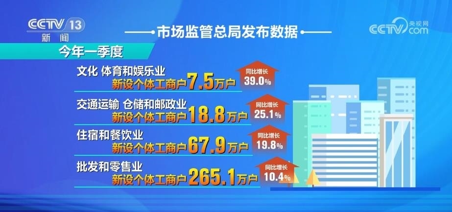市場(chǎng)監(jiān)管總局發(fā)布數(shù)據(jù)顯示,今年一季度,文化、體育和娛樂(lè)業(yè),交通運(yùn)輸、倉(cāng)儲(chǔ)和郵政業(yè),住宿和餐飲業(yè),批發(fā)和零售業(yè)等行業(yè)新設(shè)個(gè)體工商戶(hù)分別為7.5萬(wàn)戶(hù)、18.8萬(wàn)戶(hù)、67.9萬(wàn)戶(hù)、265.1萬(wàn)戶(hù),同比分別增長(zhǎng)39.0%、25.1%、19.8%、10.4%。