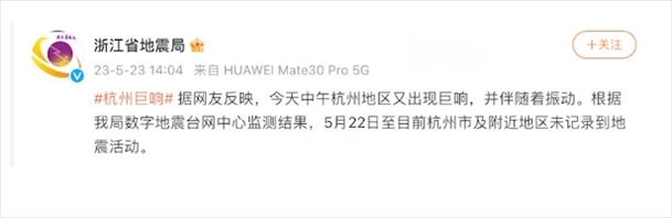 ·杭州地區(qū)出現(xiàn)巨響?浙江省地震局:未記錄到地震活動(dòng)。