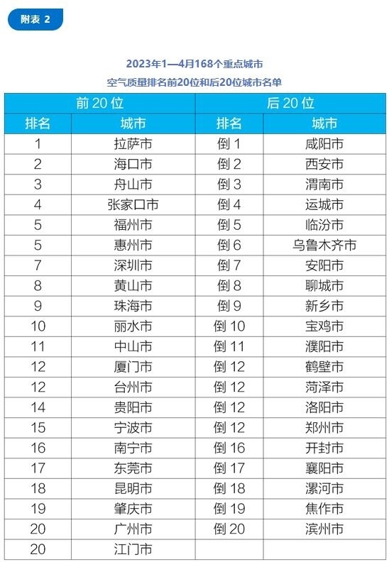 1—4月,168個重點城市中,拉薩、??诤椭凵降瘸鞘锌諝赓|量相對較好(從第1名至并列第20名);咸陽、西安和渭南等城市空氣質量相對較差(從倒數(shù)第1名至倒數(shù)第20名)。