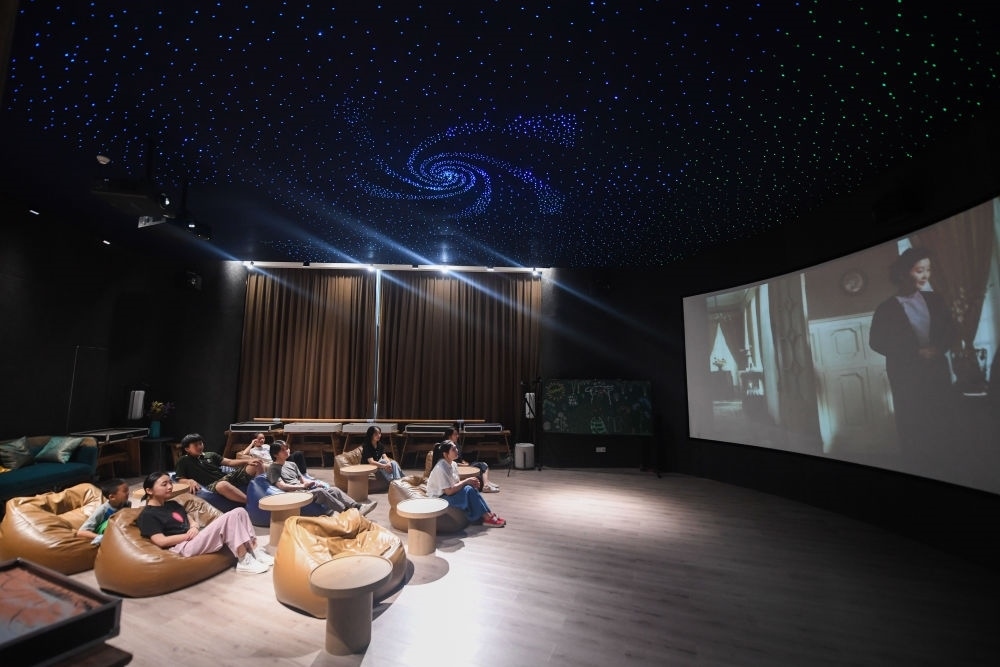 居民在位于浙江省杭州市富陽區(qū)銀湖街道硅谷社區(qū)的“合之舍”書房的影視廳觀看電影,該書房是銀湖街道“15分鐘品質(zhì)文化生活圈”的示范點(diǎn)位(2022年7月2日攝)。新華社記者 徐昱 攝