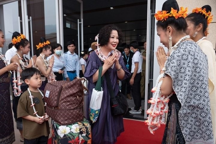 在中老鐵路老撾磨丁站,工作人員歡迎乘坐D887次國際旅客列車的旅客抵達(dá)磨丁(2023年4月13日攝)。新華社發(fā)(凱喬 攝)