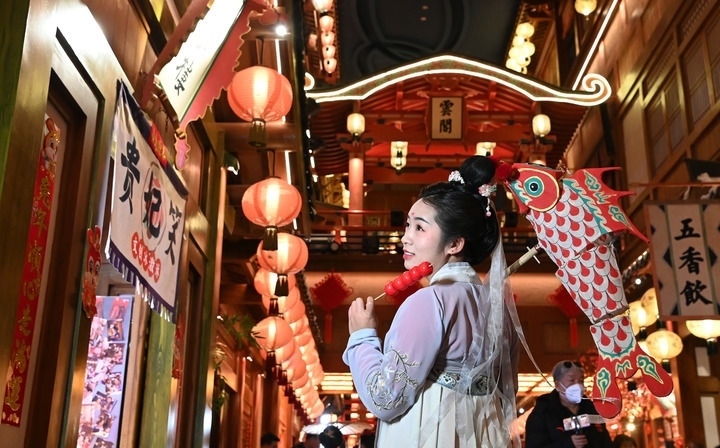 身穿傳統(tǒng)服飾的游客在陜西省西安市“長安十二時(shí)辰”主題街區(qū)游玩(2023年1月24日攝)。新華社記者 劉瀟 攝