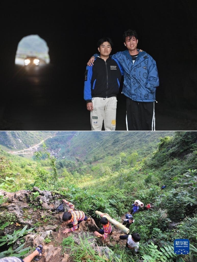 拼版照片:上圖為2023年1月20日,在大化瑤族自治縣板升鄉(xiāng)弄勇村,22歲的蒙宣任(左)和弟弟蒙宣汰站在通往弄勇小學(xué)的隧道旁合影,隧道上方是他們兒時上學(xué)需要攀爬的“天梯”;下圖為2012年9月3日,在大化瑤族自治縣板升鄉(xiāng)弄勇村,蒙宣汰(左一)、蒙宣任(左二)爬山路去學(xué)校。蒙宣任目前在遼寧省交通高等??茖W(xué)校讀書,弟弟蒙宣汰從技校畢業(yè)后在廣東一家汽修廠上班。
