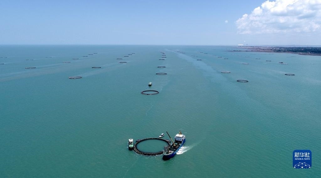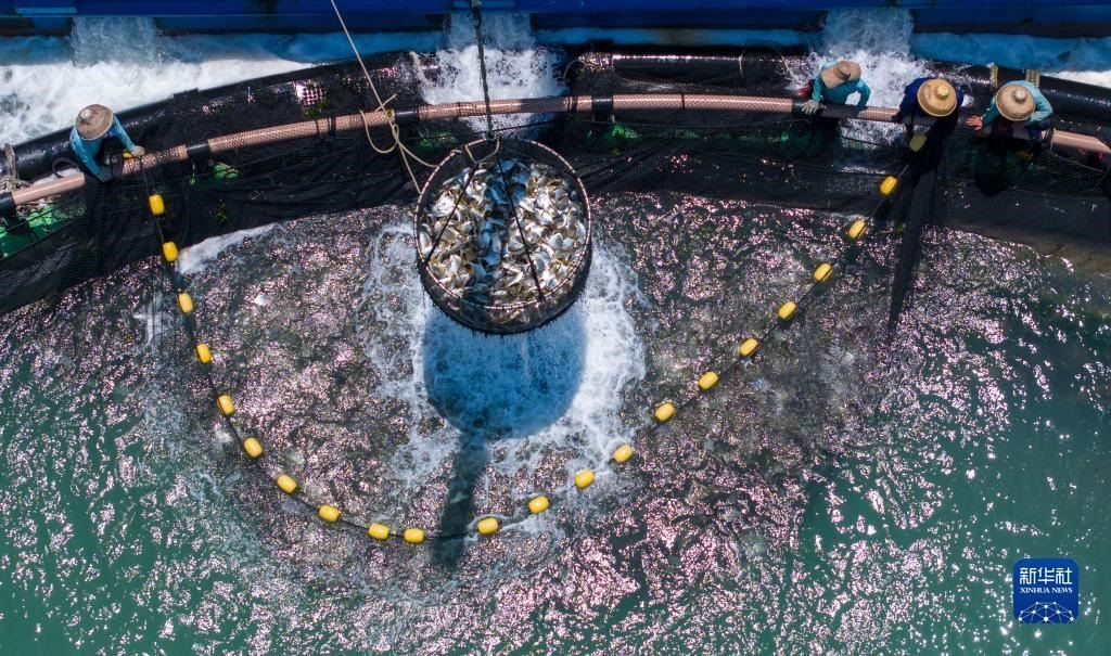 廣東省湛江市是全國最大的金鯧魚養(yǎng)殖基地之一,被譽為“中國金鯧魚之都”。在深藍色海面上,整齊分布著一串串100米左右周長的深海網(wǎng)箱,孕育著被譽為“黃金魚”的金鯧魚,年產(chǎn)量約10萬噸,約占全國產(chǎn)量三到四成,除了供應(yīng)中國市場,還出口到美國、印度、馬來西亞等國家和地區(qū)。隨著近年金鯧魚深海養(yǎng)殖規(guī)模化、集群化、市場化步伐加快,小小“黃金魚”每年可創(chuàng)造百億元產(chǎn)值。