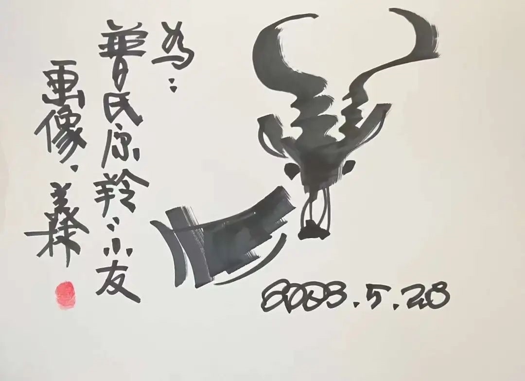 ▲韓美林為原青海省第十二屆人大常委會(huì)黨組副書記,現(xiàn)三江源生態(tài)保護(hù)基金會(huì)理事長(zhǎng)鄧本太簽書留念