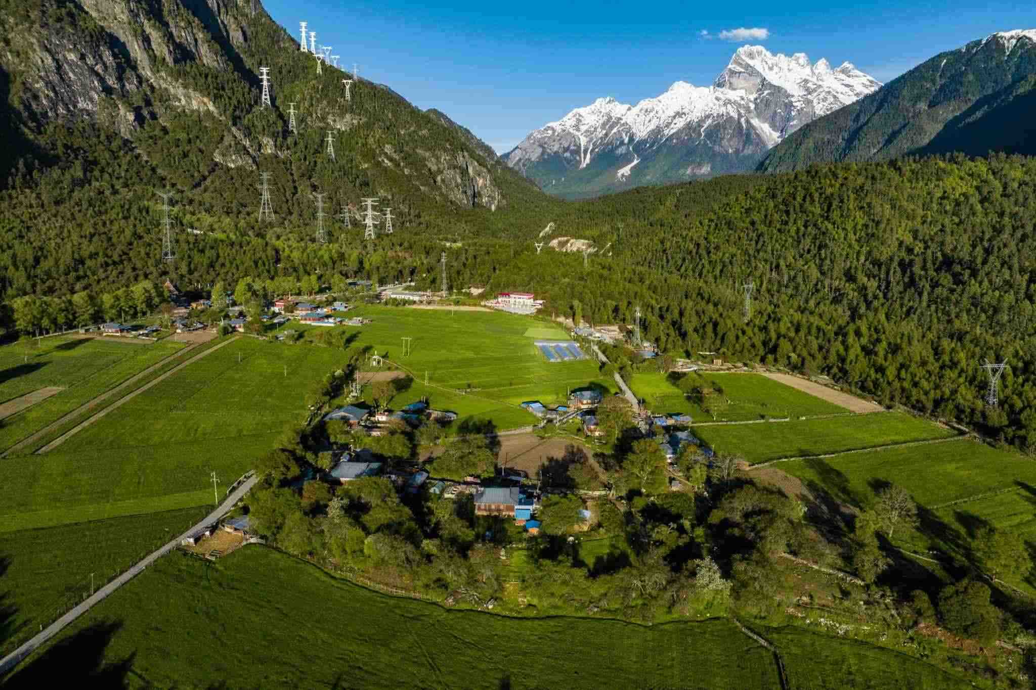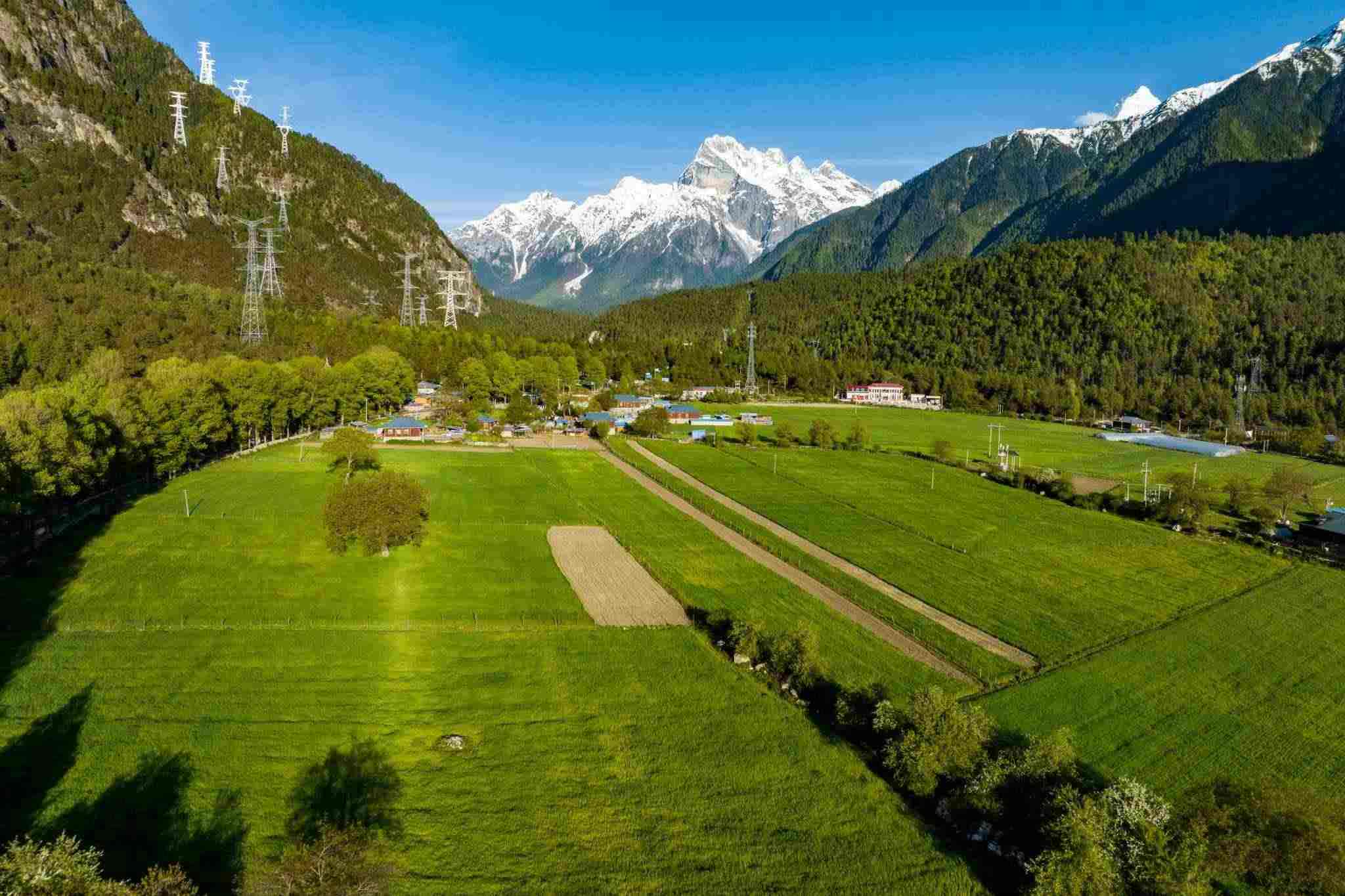 西藏林芝:村莊樹(shù)木茂密 遠(yuǎn)處雪山巍峨