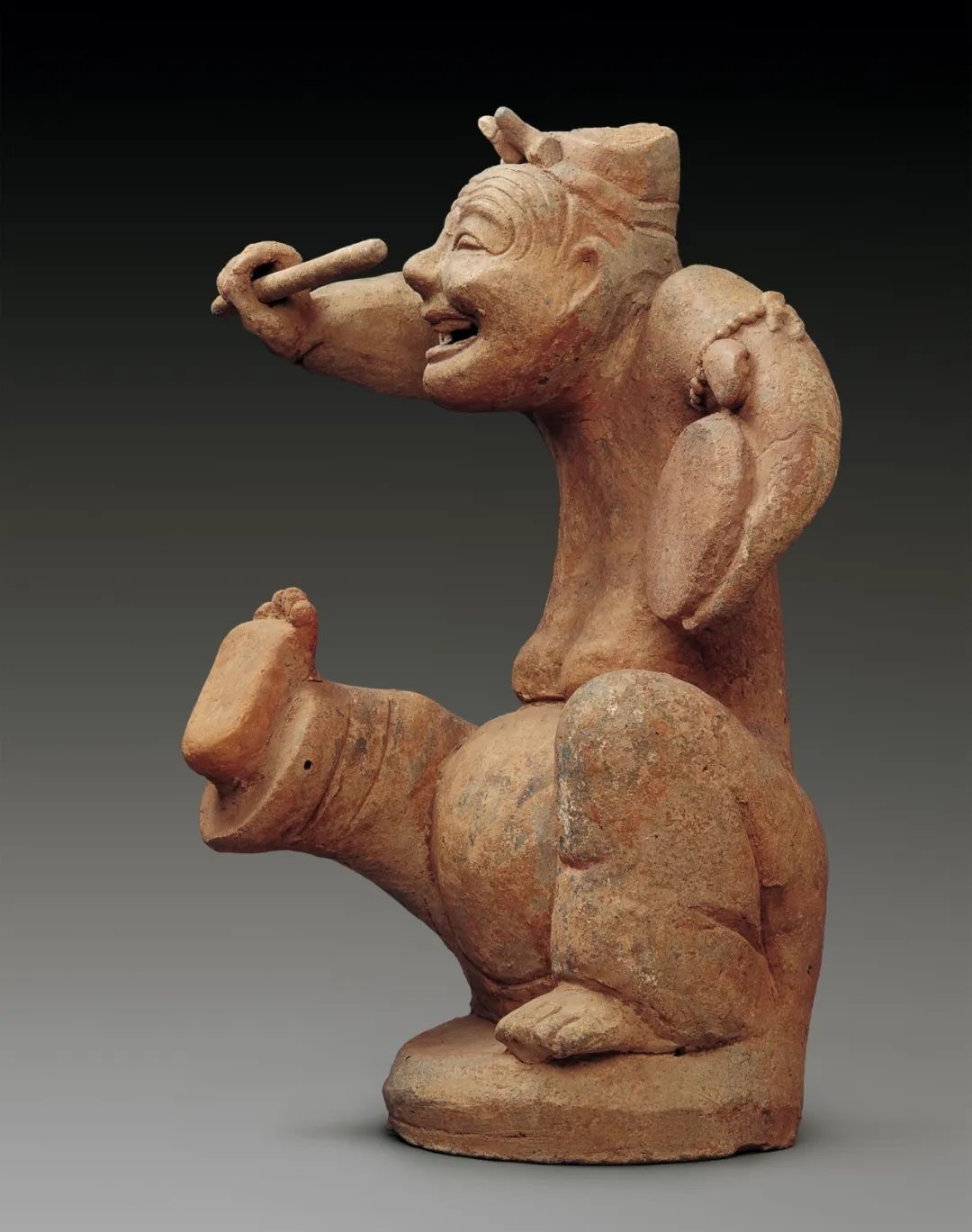 此俑頭上戴幘,額前有花飾,袒胸露腹,兩肩高聳,著褲赤足,左臂環(huán)抱一扁鼓,右手舉槌欲擊,張口嘻笑,神態(tài)詼諧,動作夸張,活現(xiàn)一俳優(yōu)正在說唱的形象。