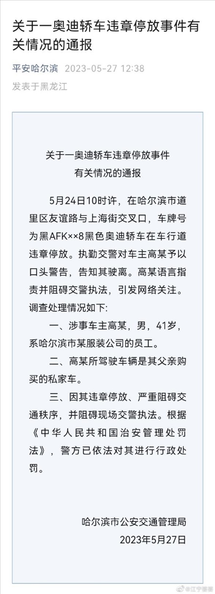 ·哈爾濱警方通報網傳副市長違停與交警沖突:涉事車主為服裝公司員工。