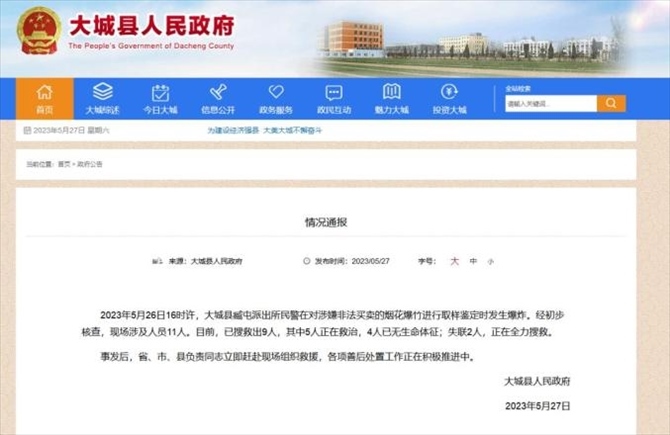 ·河北大城一派出所煙花爆竹取樣鑒定時發(fā)生爆炸,已致4死2失聯(lián),5人正在救治。