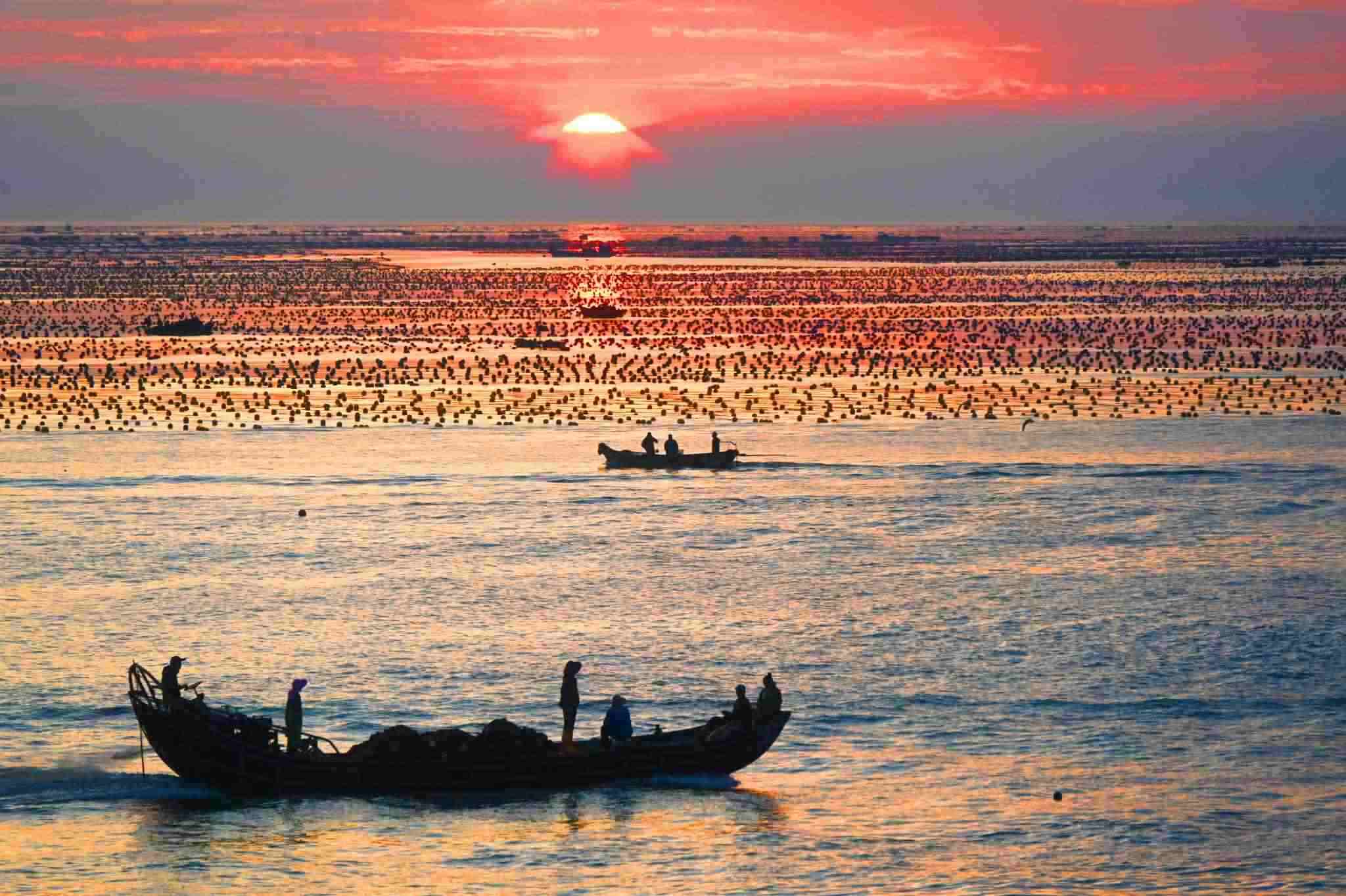 2023年5月31日,山東威海,榮成愛倫灣海洋牧場(chǎng),漁民駕駛船只在海上收獲海帶,美麗的朝霞倒影在海上,海鷗伴舞,海洋牧場(chǎng)到處呈現(xiàn)一派豐收的喜人景象。視覺中國(guó)