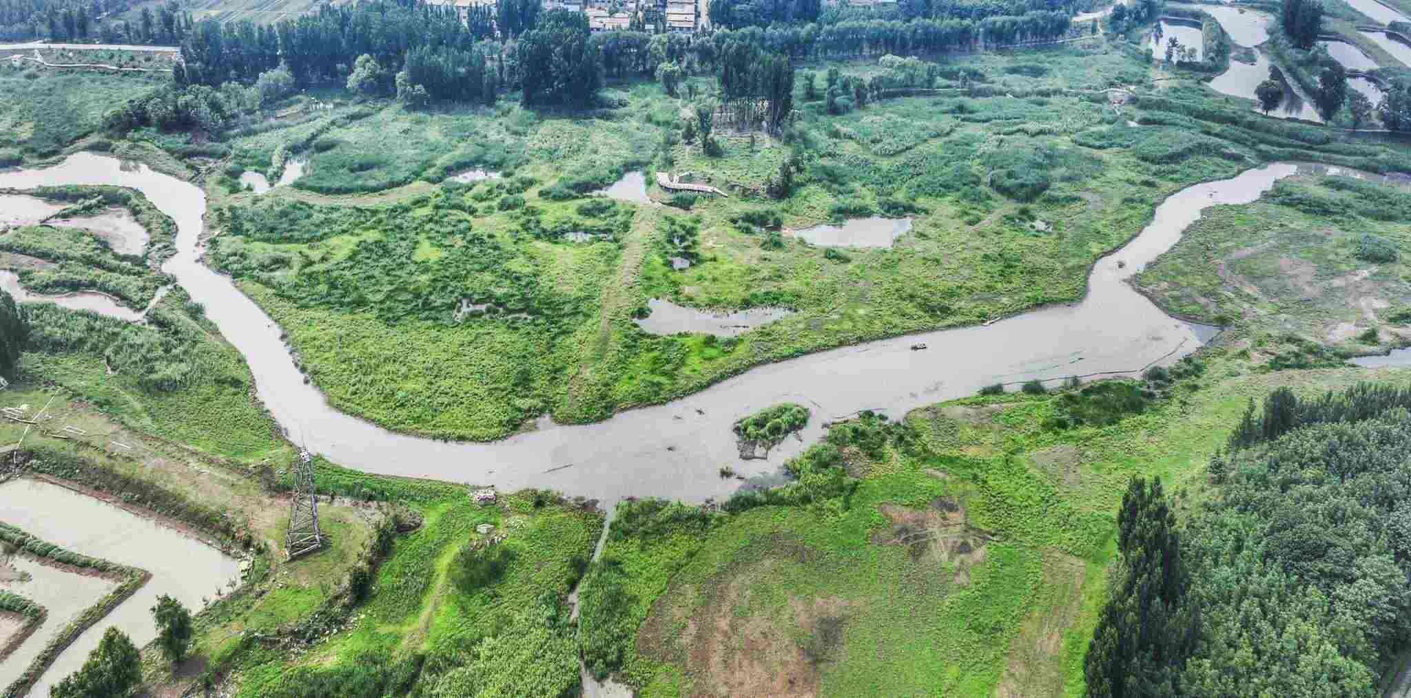 2023年5月31日,山東棗莊,薛城區(qū)蟠龍河國(guó)家濕地公園綠意盎然、流水潺潺、水鳥翩躚而至,繪就一幅美麗的生態(tài)畫卷。視覺中國(guó)