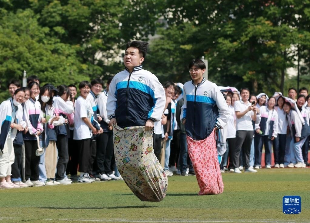 5月31日,在淮北市第十二中學(xué),高三學(xué)生在參加“袋鼠跳”趣味減壓游戲。