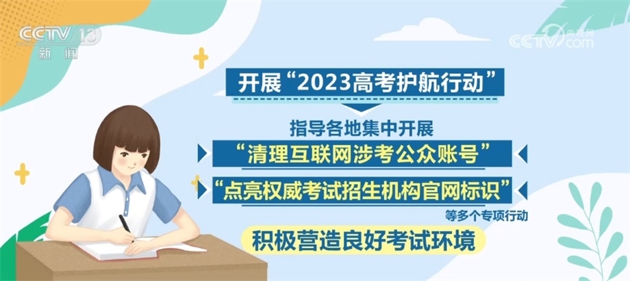此外,將繼續(xù)開展“2023高考護航行動”,指導(dǎo)各地集中開展“清理互聯(lián)網(wǎng)涉考公眾賬號”“點亮權(quán)威考試招生機構(gòu)官網(wǎng)標識”等多個專項行動,積極營造良好考試環(huán)境。