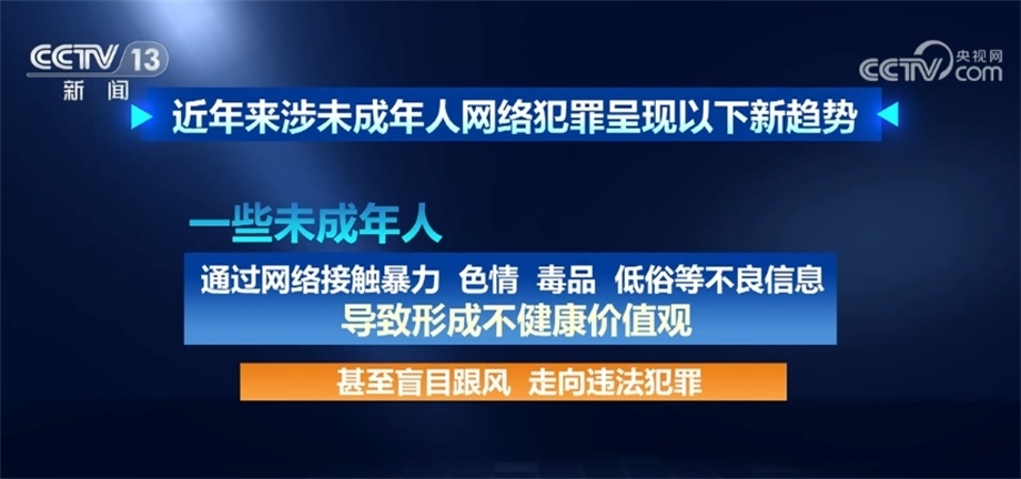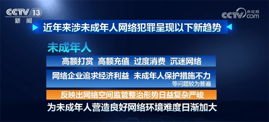 據(jù)最高檢相關(guān)部門(mén)負(fù)責(zé)人介紹,近年來(lái)涉未成年人網(wǎng)絡(luò)犯罪呈現(xiàn)以下新趨勢(shì):未成年人觸網(wǎng)低齡化日趨明顯,更易遭受網(wǎng)絡(luò)不法侵害;利用網(wǎng)絡(luò)侵害未成年人犯罪手段復(fù)雜多樣,方式不斷翻新,“網(wǎng)絡(luò)誘騙”“隔空猥褻”等新類(lèi)型犯罪隱蔽性強(qiáng)、打擊難度大;一些未成年人通過(guò)網(wǎng)絡(luò)接觸暴力、色情、毒品、低俗等不良信息,導(dǎo)致形成不健康價(jià)值觀,甚至盲目跟風(fēng)、走向違法犯罪;未成年人高額打賞、高額充值、過(guò)度消費(fèi)、沉迷網(wǎng)絡(luò),網(wǎng)絡(luò)企業(yè)追求經(jīng)濟(jì)利益、未成年人保護(hù)措施不力等問(wèn)題較為普遍,反映出網(wǎng)絡(luò)空間監(jiān)管整治形勢(shì)日益復(fù)雜嚴(yán)峻,為未成年人營(yíng)造良好網(wǎng)絡(luò)環(huán)境難度日漸加大。