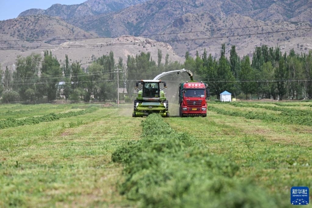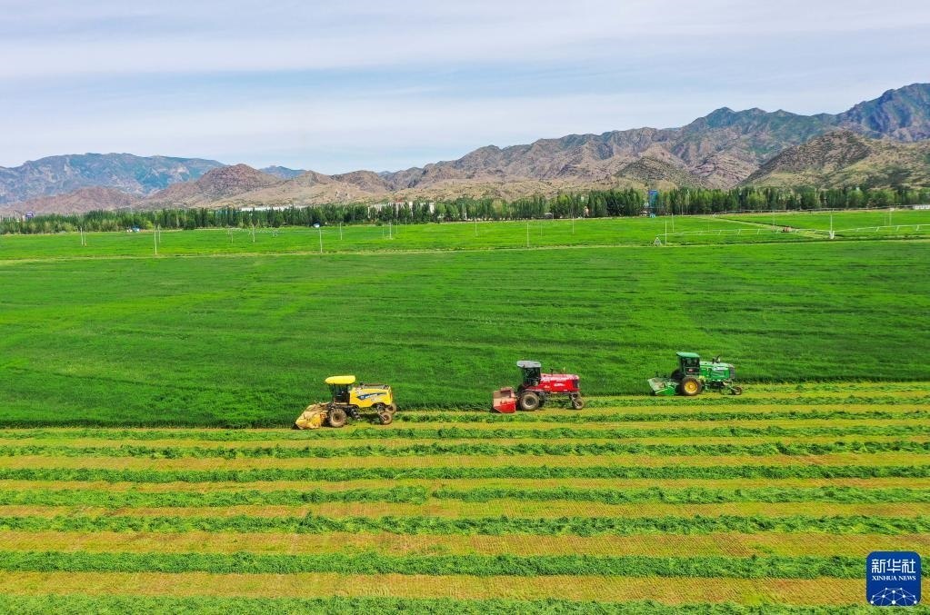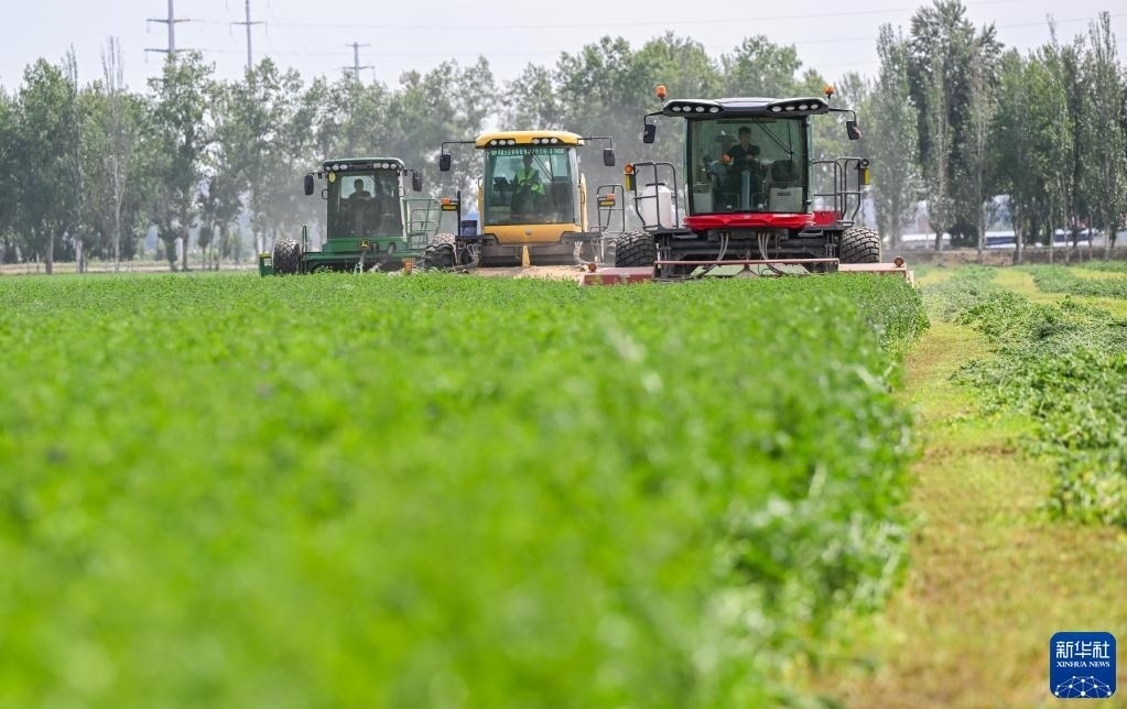 6月4日,在土默特左旗國(guó)家現(xiàn)代農(nóng)業(yè)示范區(qū)內(nèi),機(jī)械車輛在收割苜蓿。