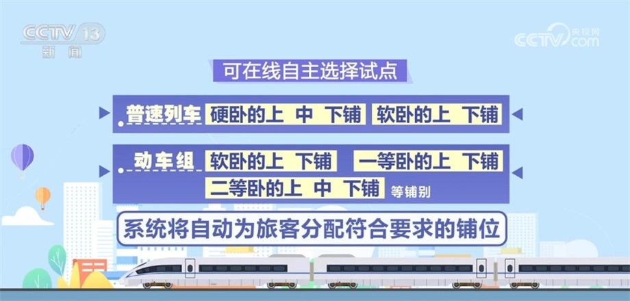 這次試行在線選鋪服務(wù)的230趟旅客列車,主要針對普速旅客列車和部分高鐵列車,涵蓋范圍包括普速列車的軟臥、硬臥和動車組的軟臥、一等臥、二等臥等鋪別。同時,繼續(xù)實行對60歲以上老人等重點旅客優(yōu)先分配下鋪的服務(wù)。