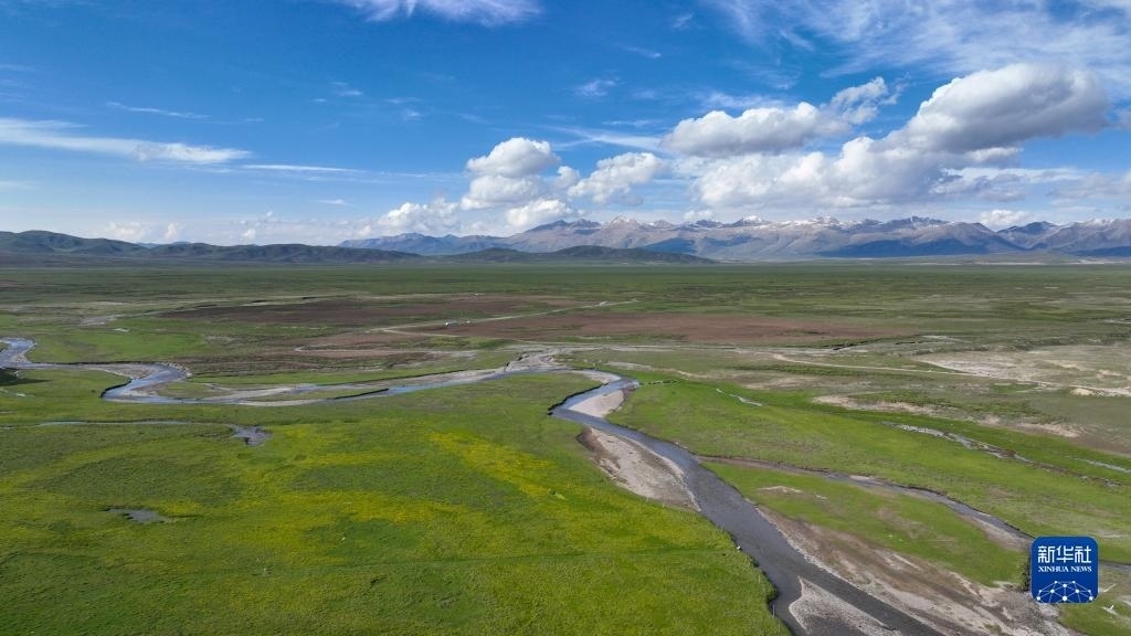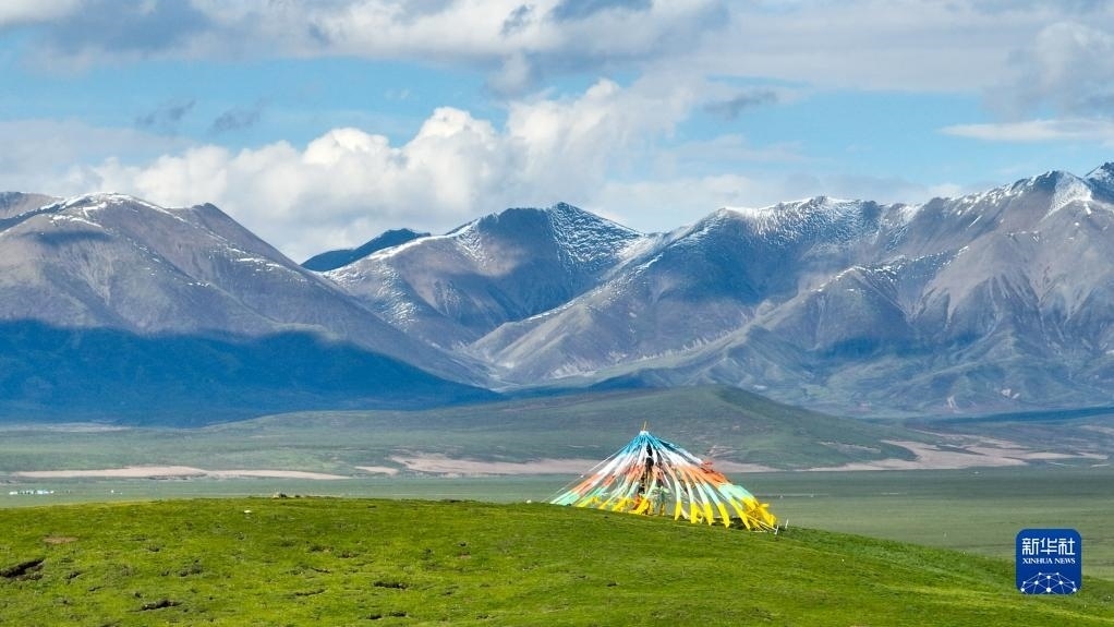 夏日,青海省南部的高原草原一碧千里,與雪山、白云相映成趣,景色宜人。