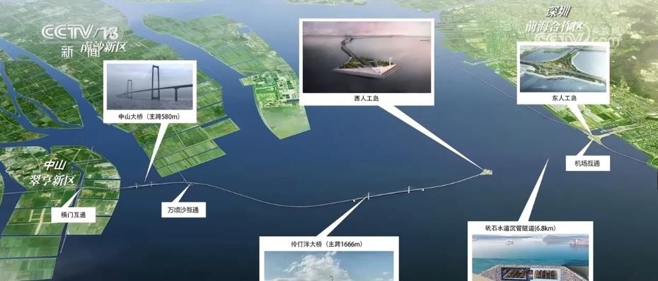 全長(zhǎng)約24公里的深中通道橫跨珠江口,集“橋、島、隧、水下互通”于一體,關(guān)鍵控制性工程為伶仃洋大橋和海底沉管隧道,控制性工程包括中山大橋、東人工島、西人工島。