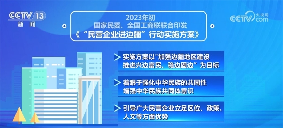 2023年初,國家民委、全國工商聯(lián)聯(lián)合印發(fā)了《“民營企業(yè)進邊疆”行動實施方案》,實施方案以“加強邊疆地區(qū)建設(shè),推進興邊富民、穩(wěn)邊固邊”為目標,著眼于強化中華民族的共同性、增強中華民族共同體意識,引導(dǎo)廣大民營企業(yè)立足區(qū)位、政策、人文等方面優(yōu)勢,積極參與邊疆地區(qū)基礎(chǔ)設(shè)施建設(shè),助力邊疆地區(qū)提升資源轉(zhuǎn)化能力,推動邊疆地區(qū)融入全國統(tǒng)一大市場,促進邊疆各民族交往交流交融,共同走向社會主義現(xiàn)代化,實現(xiàn)共同富裕。