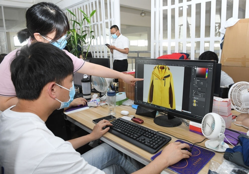 在浙江省臺州市三門縣的一家戶外用品企業(yè),工作人員在討論一款沖鋒衣的設(shè)計(jì)(2022年6月14日攝)。新華社記者 翁忻旸 攝