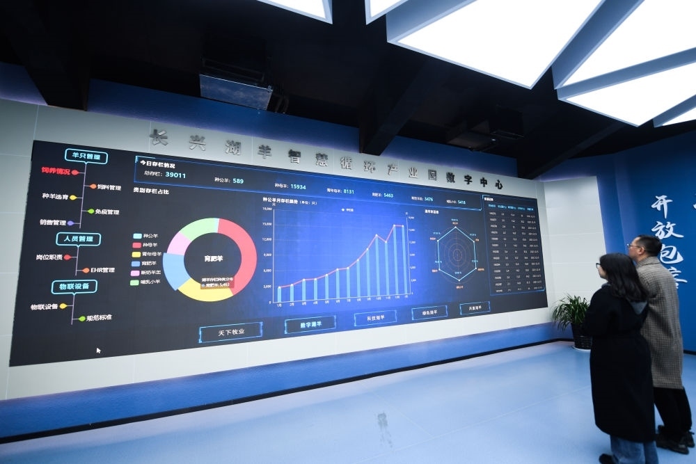 浙江省湖州市長興縣呂山鄉(xiāng)湖羊智慧循環(huán)產(chǎn)業(yè)園里的數(shù)字大屏實(shí)時顯示湖羊的各類監(jiān)控?cái)?shù)據(jù)(2022年1月6日攝)。新華社記者 徐昱 攝