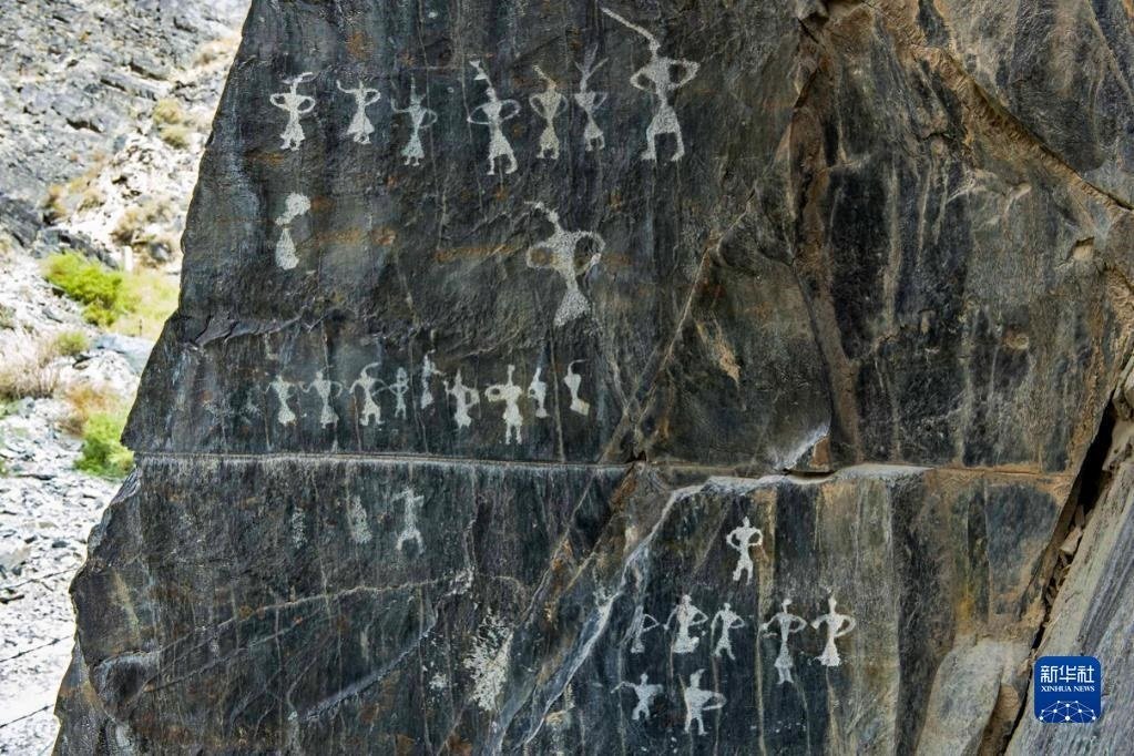 甘肅省嘉峪關(guān)市黑山巖畫中的一幅眾人舞蹈巖畫(資料照片)。