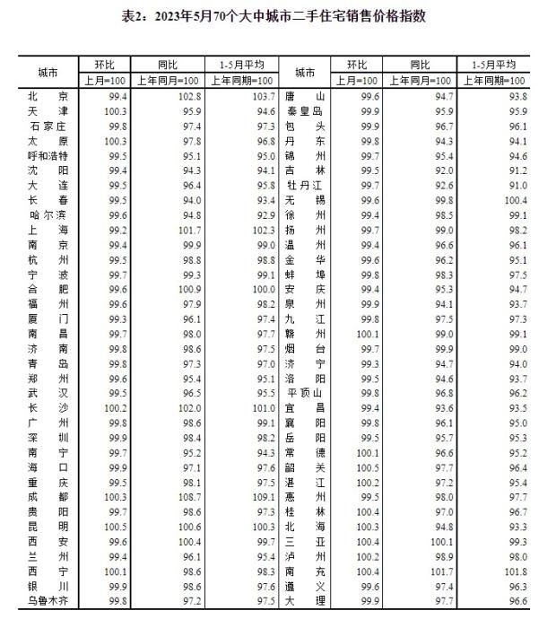 2023年5月70個(gè)大中城市二手住宅銷售價(jià)格指數(shù)。 截圖自國家統(tǒng)計(jì)局官網(wǎng)