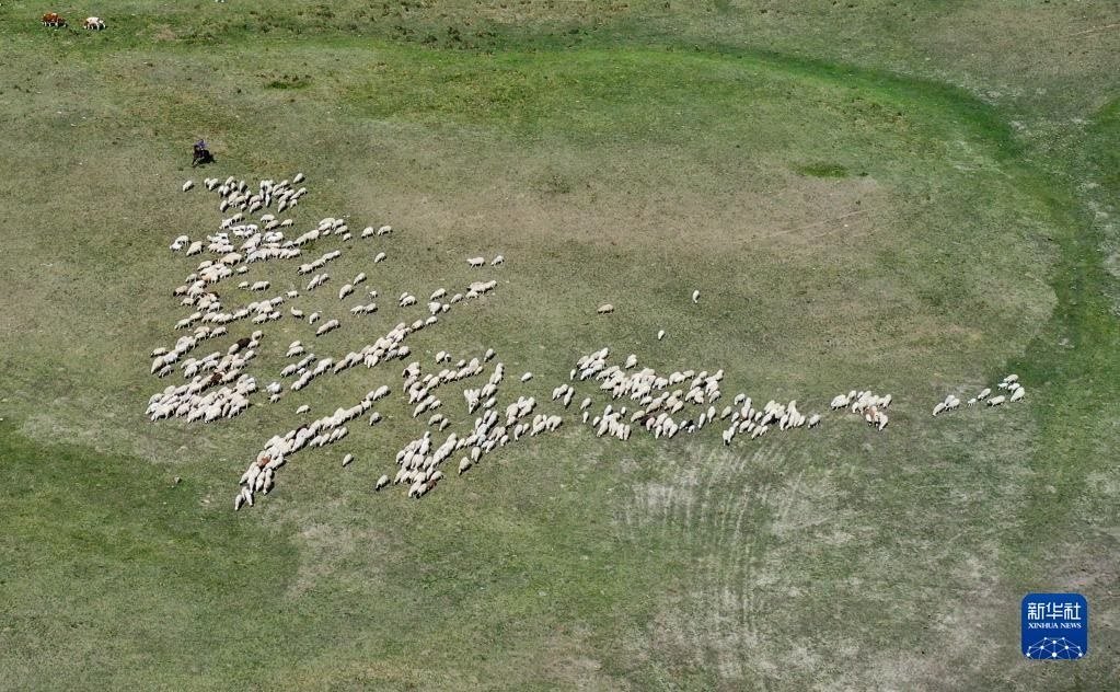 6月15日,羊群在草原上覓食(無(wú)人機(jī)照片)。