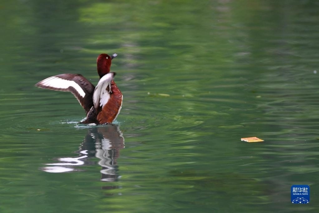 夏日里,白眼潛鴨和鳳頭潛鴨在西藏拉薩市拉魯濕地國家級自然保護區(qū)中干渠里覓食、嬉戲。新華社記者 張汝鋒 攝