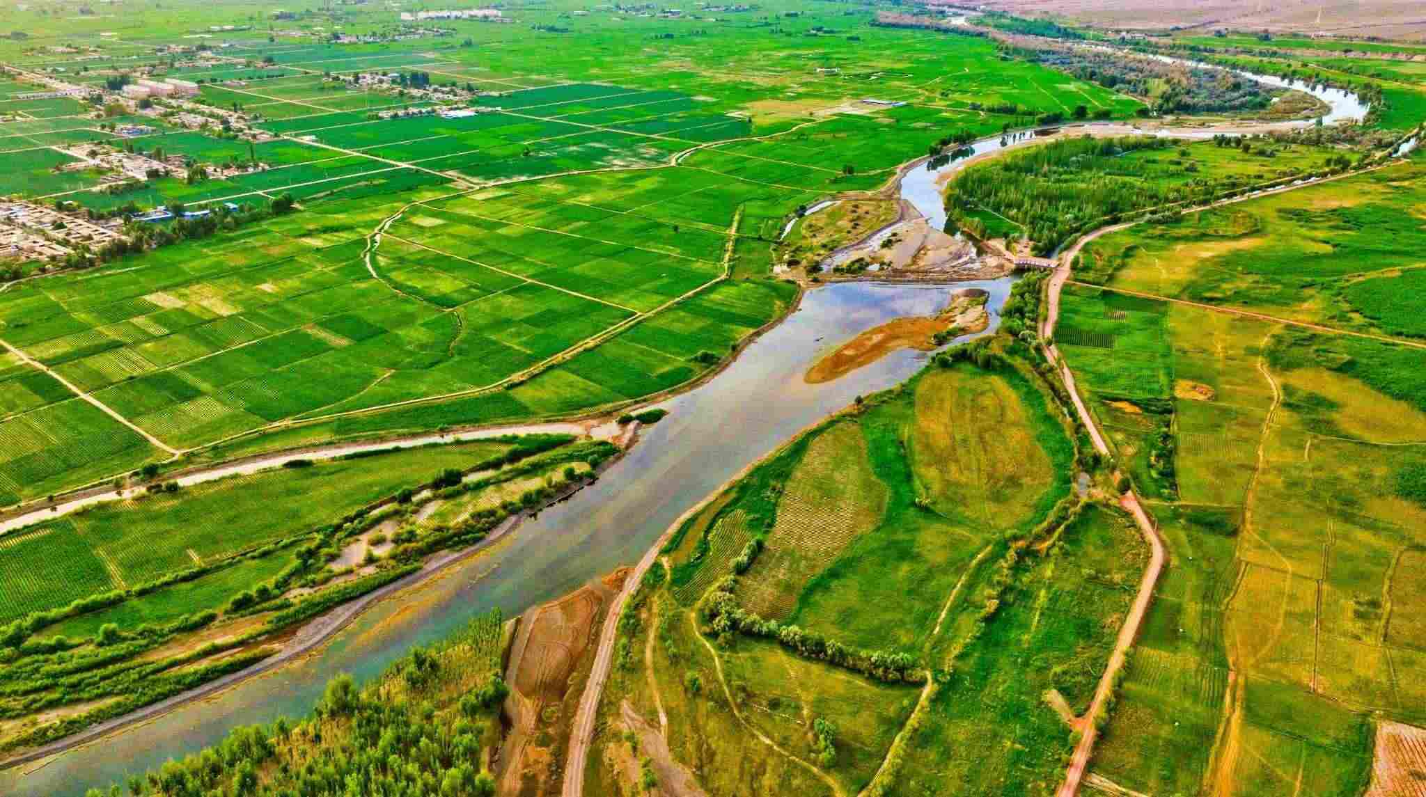 2023年6月15日,甘肅省張掖市,甘州區(qū)靖安鄉(xiāng)、臨澤縣板橋鎮(zhèn)境內(nèi)的黑河兩岸,寬闊的河床、彎曲的河流、農(nóng)作物以及樹木、蘆葦、濕地在夕陽的映照下綠意盎然。視覺中國(guó)
