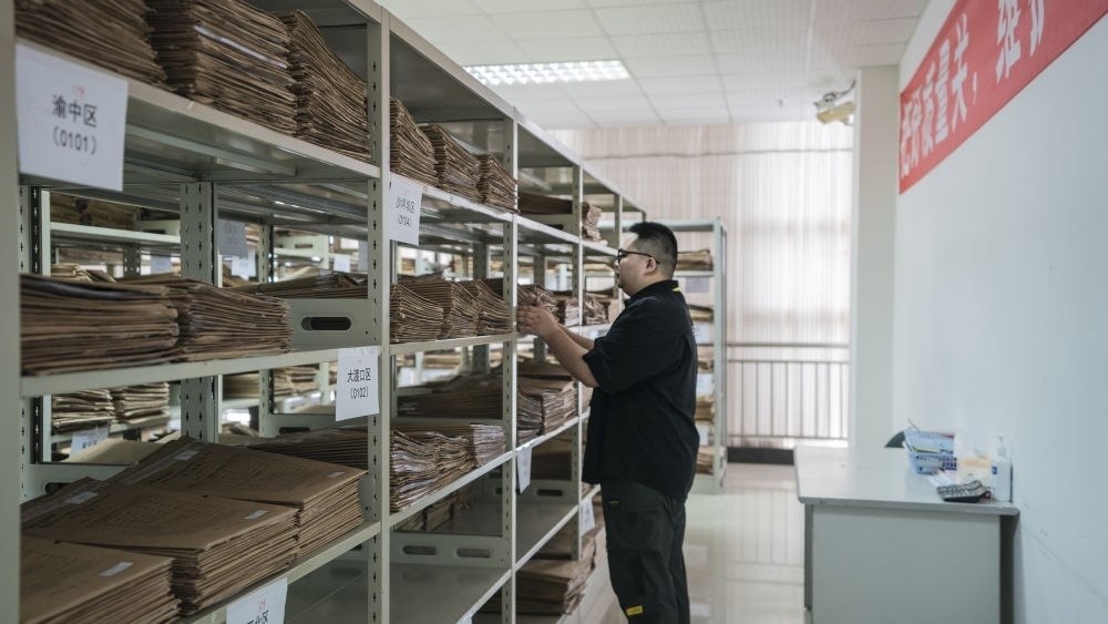 6月13日,在西南大學(xué)評(píng)卷點(diǎn),工作人員將完成掃描后的高考答卷及答題卡裝入檔案袋集中管理。新華社記者李前磊 攝