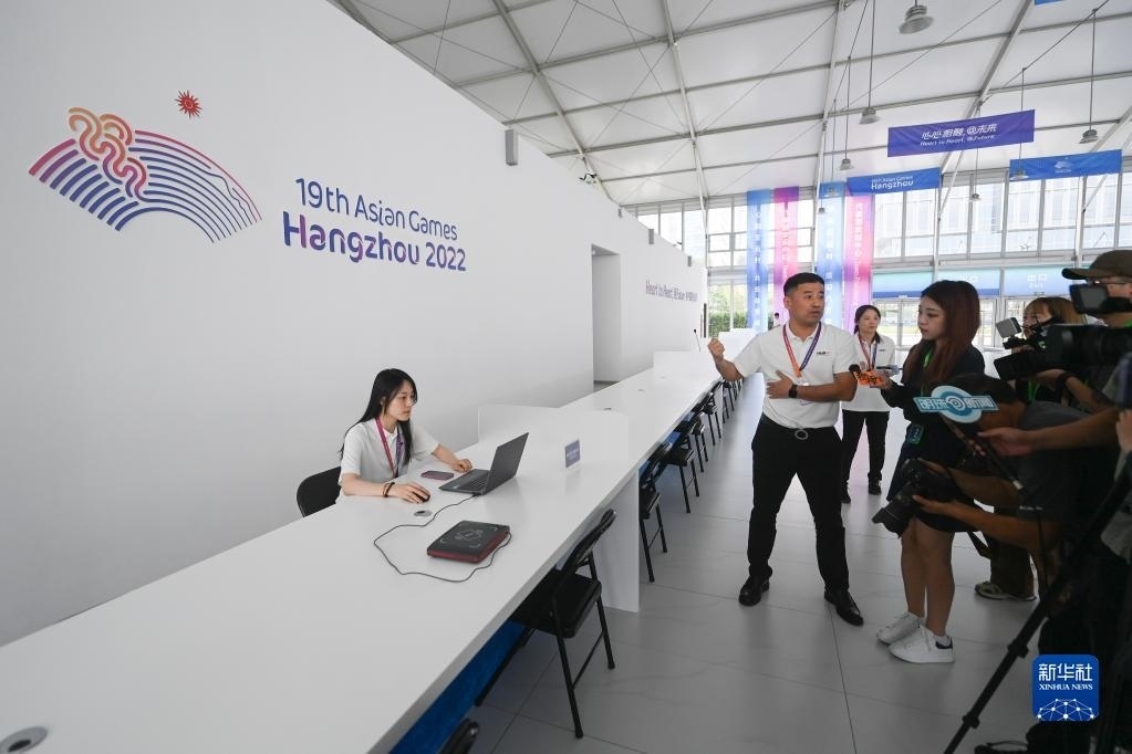 6月16日,工作人員在杭州亞運(yùn)村歡迎中心介紹服務(wù)流程。歡迎中心包含代表團(tuán)歡迎中心、媒體中心和訪客中心三個(gè)部分,其中代表團(tuán)歡迎中心是所有代表團(tuán)抵達(dá)亞運(yùn)村的第一站,將提供24小時(shí)全天候服務(wù)。