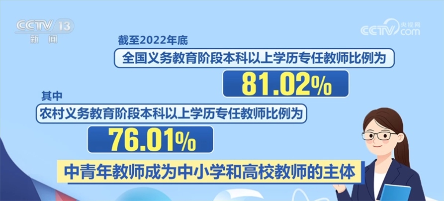 近年來,“特崗計(jì)劃”、“三區(qū)”人才支持計(jì)劃教師專項(xiàng)計(jì)劃等源源不斷地為鄉(xiāng)村學(xué)校補(bǔ)充高素質(zhì)教師。優(yōu)師計(jì)劃、師范教育協(xié)同提質(zhì)計(jì)劃、國(guó)優(yōu)計(jì)劃等的實(shí)施,也在助力優(yōu)秀教師的培養(yǎng)。我國(guó)各級(jí)各類教師隊(duì)伍學(xué)歷不斷提高、年齡結(jié)構(gòu)不斷優(yōu)化。截至2022年底,全國(guó)義務(wù)教育階段本科以上學(xué)歷專任教師比例為81.02%,其中,農(nóng)村義務(wù)教育階段本科以上學(xué)歷專任教師比例為76.01%,中青年教師成為中小學(xué)和高校教師的主體。