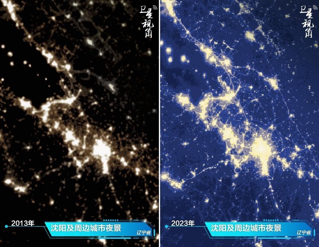 ↑2023年與2013年相比,沈陽及周邊城市夜光更亮了。